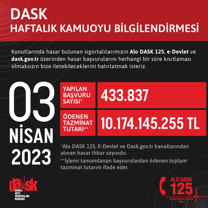 DASK'ta bugün itibarıyla tarafımıza ulaşan hasar ihbar sayısı 433.837 ve ödenen tazminat tutarı ise 10.174.145.255 TL'ye ulaştı.