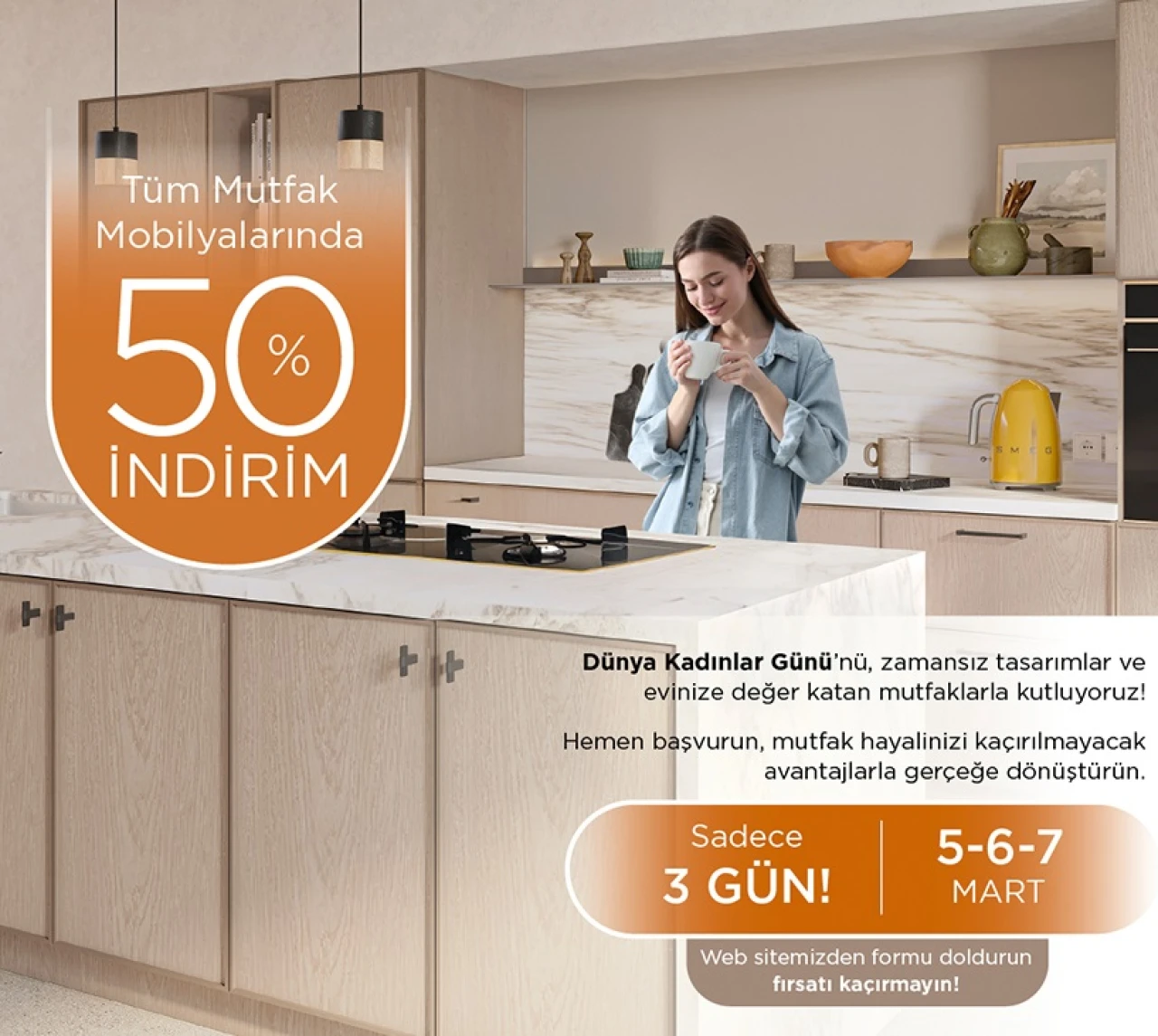 Benzersiz tasarımlarıyla mutfakları yaşam alanlarına dönüştürerek evlere değer katan İntema, Dünya Kadınlar Günü’nü anlamlı kampanyasıyla kutluyor. Kampanya kapsamında, 5-6-7 Mart tarihlerinde başvuru formunu dolduranların 31 Mart tarihine kadar vereceği mutfak siparişlerinde yüzde 50 indirim sağlanırken, Worldcard’a özel 8 aya varan taksit imkânı sunuluyor. Mutfak mobilyası alışverişleri için geçerli olan kampanya nakliye, montaj, aksesuar, tezgâh ve cihaz gibi tamamlayıcı ürün ve hizmetleri kapsamıyor.