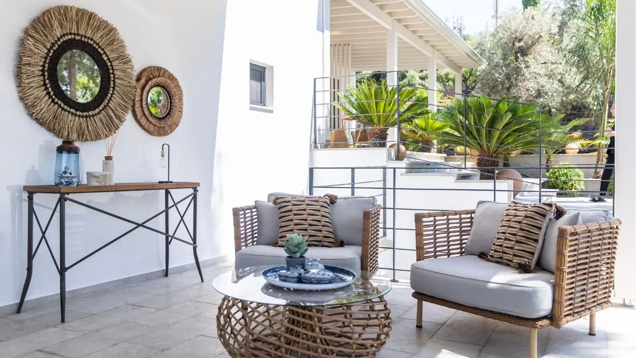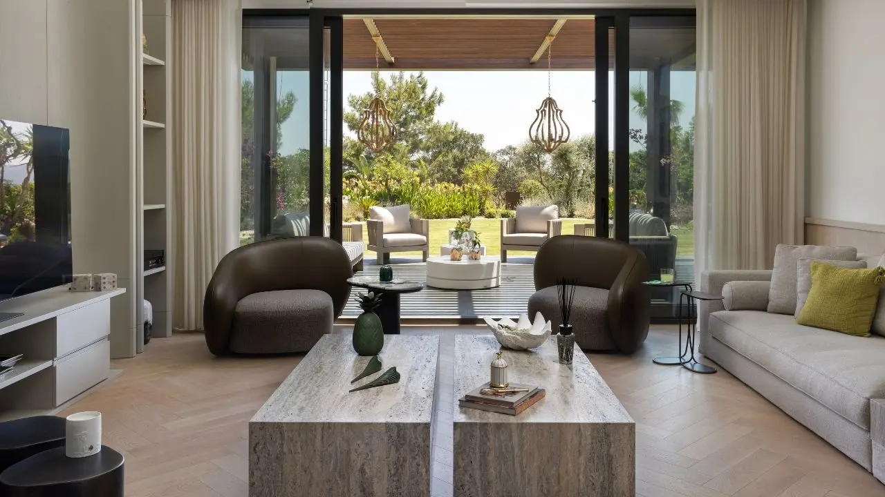 🔹 Salon: Modüler koltuklar, cam ve hasır gibi doğal dokular, metal detaylı sehpalar