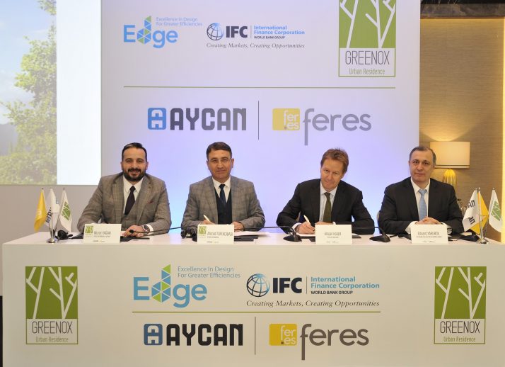 Greenox’un EDGE Yeşil Bina Sektörel Gelişim Programı kapsamında pilot proje seçilmesine ilişkin imza töreni Aycan Gayrimenkul Başkanı Ahmet Tüfekçibaşı, Feres Gayrimenkul Yatırım Ortağı Murat Yağan, Aycan & Feres İş Ortaklığı Yönetim Kurulu Üyesi ve Proje Konsept Mimarı Salih Çıkman, IFC Ülke Yöneticisi Jesper Kjaer, IFC Kıdemli Özel Sektör Geliştirme Uzmanı Eduard Yakubov ve IFC Yeşil Binalar Danışmanı Naz Beykan’ın katılımıyla gerçekleştirildi.