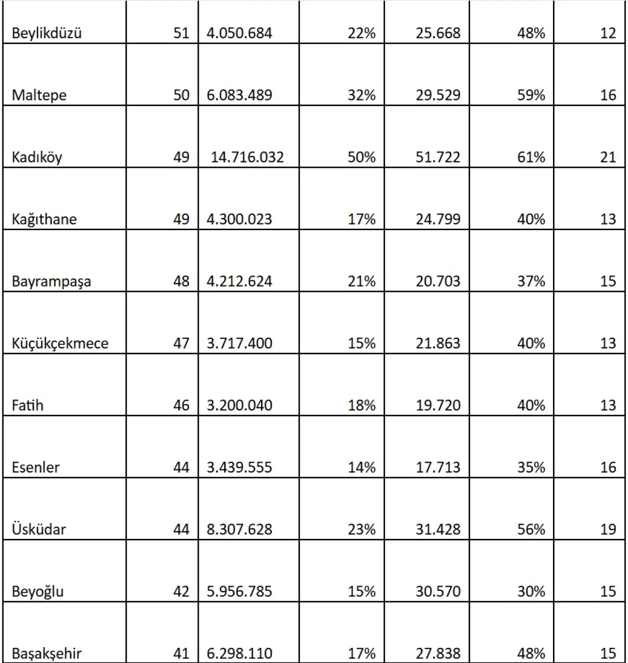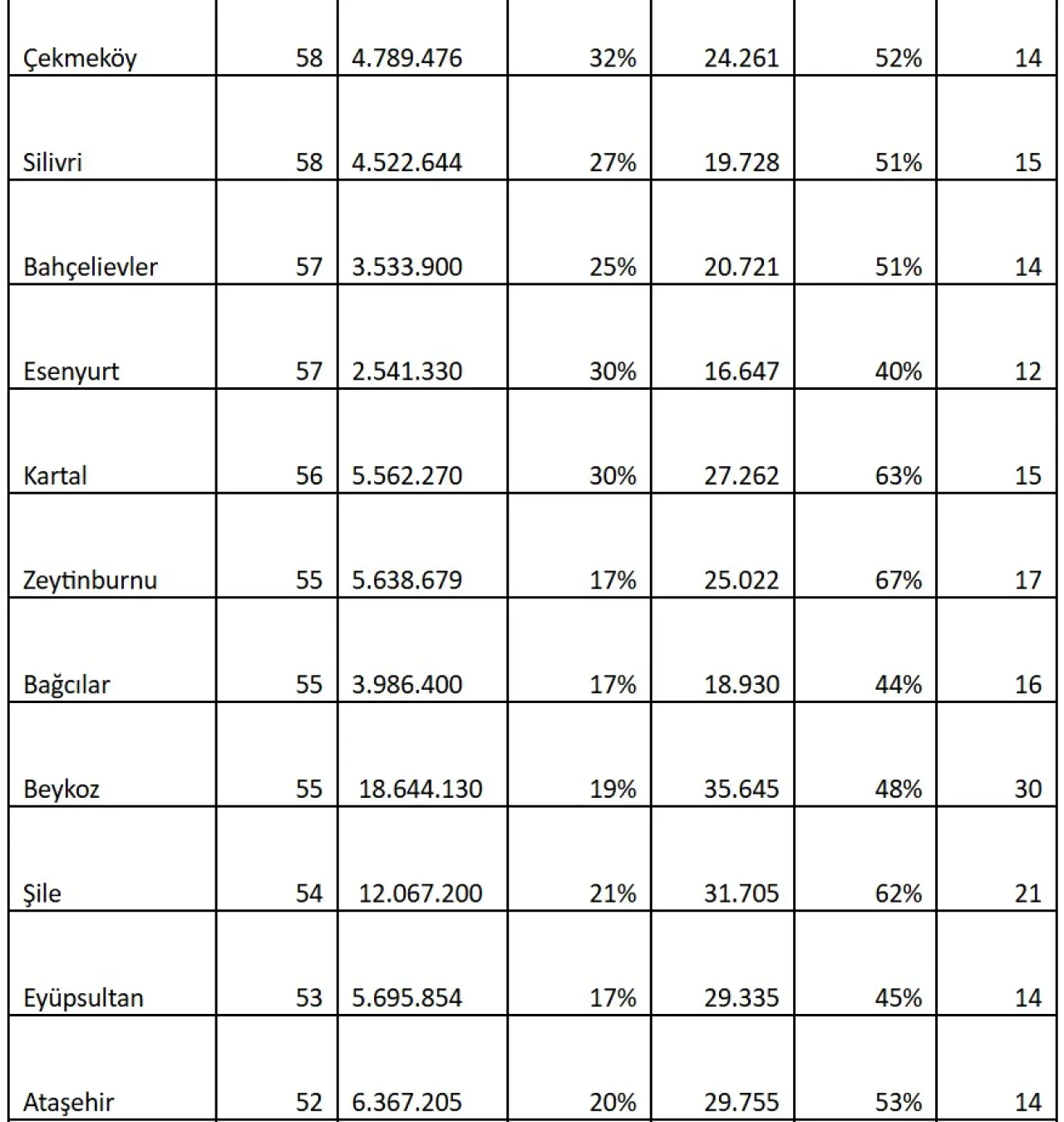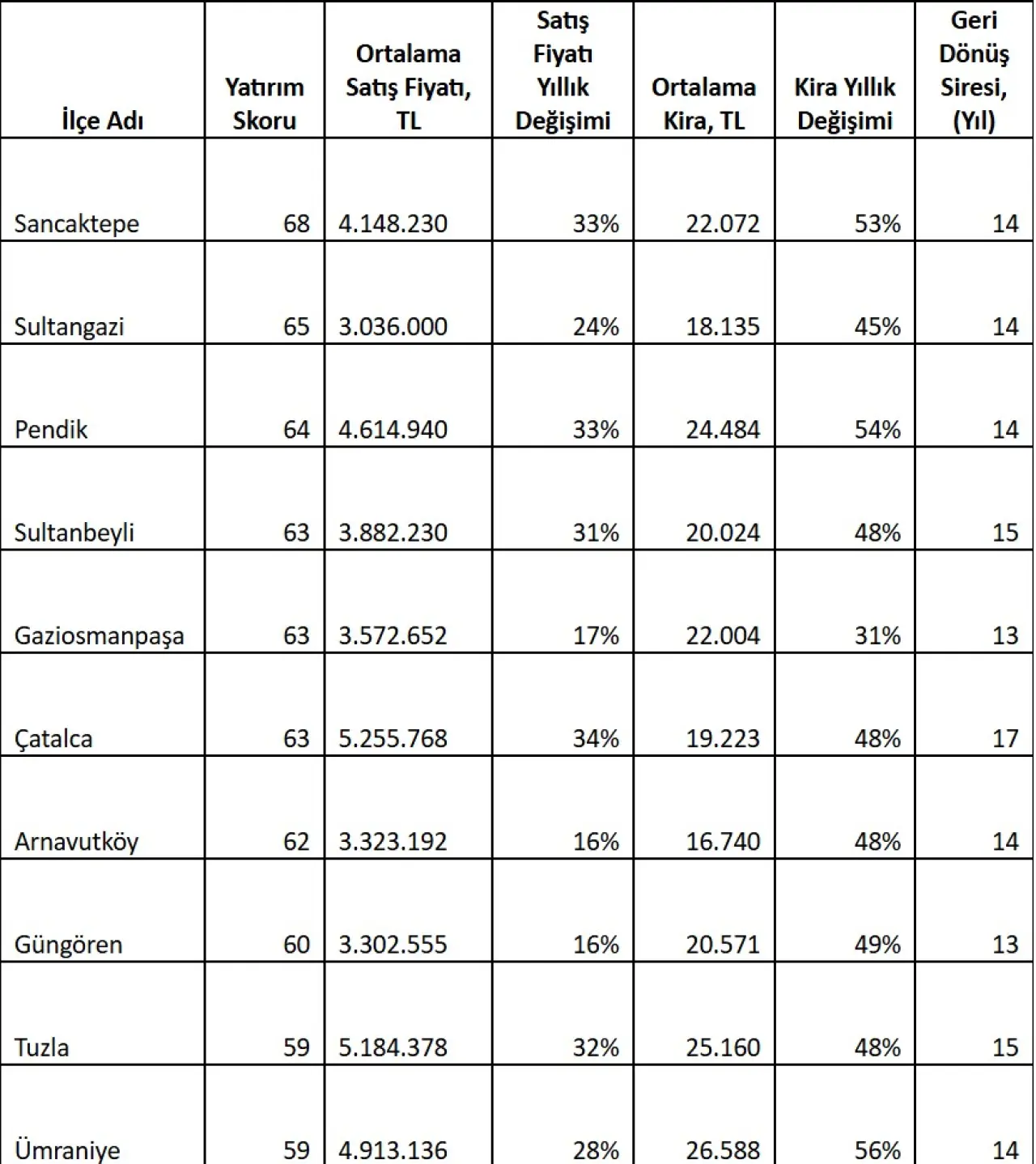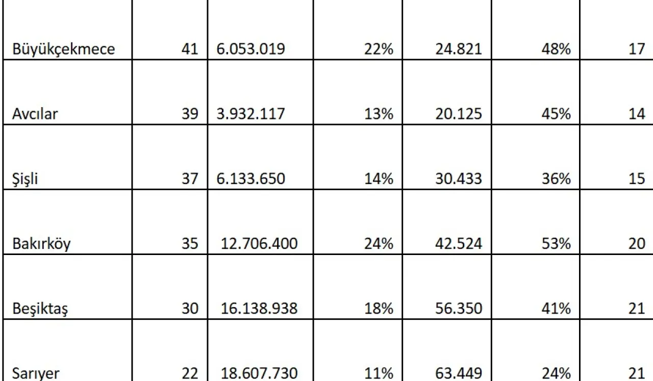 Çalışmada, İstanbul’un yatırım skoru en düşük ilçesi 22 puan ile Sarıyer oldu. Ortalama konu satış fiyatının 18,6 milyon TL ve ortalama kiranın 63.449 TL olduğu ilçede, satış fiyatları son bir yılda sadece %11 artış gösterirken kiralar %24 arttı. İlçede konut yatırımının geri dönüş süresi ise 21 yıla kadar yükselmiş durumda.