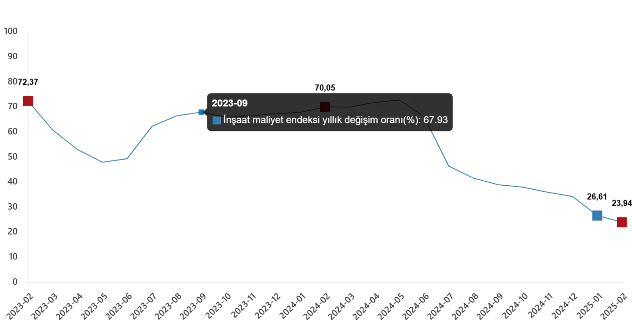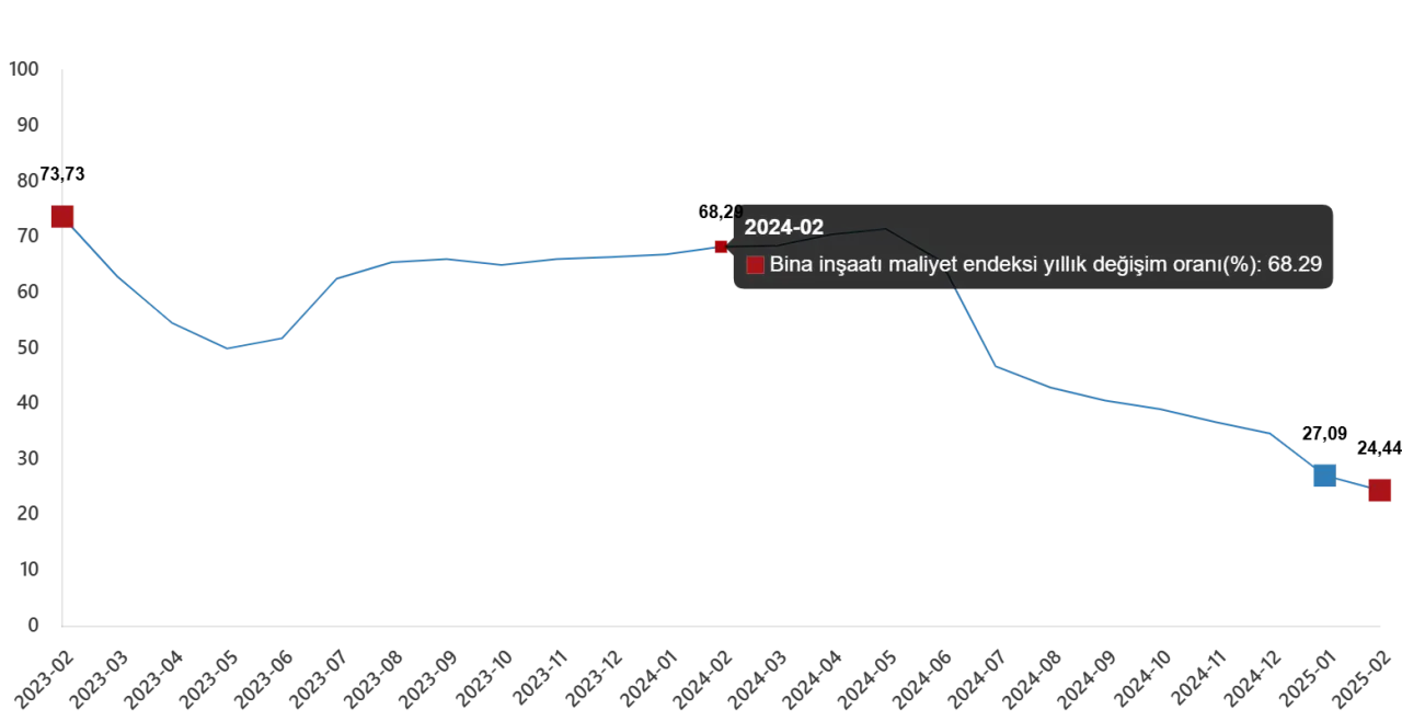 İnşaat maliyet endeksi yıllık değişim oranı (%), Şubat 2025