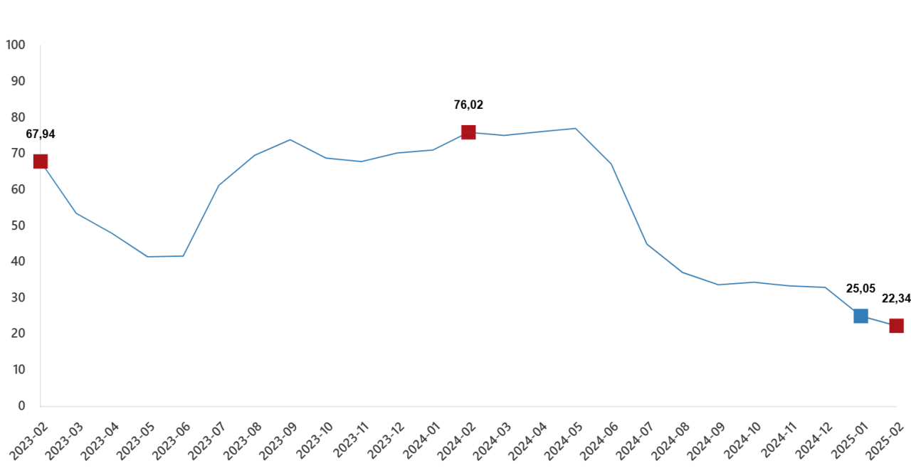 İnşaat maliyet endeksi yıllık değişim oranları (%), Şubat 2025