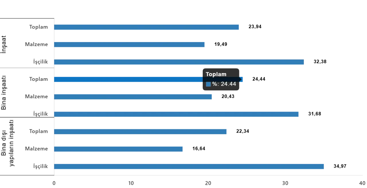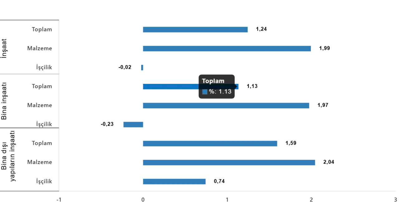 Bina inşaatı maliyet endeksi, bir önceki aya göre yüzde 1,13 arttı, bir önceki yılın aynı ayına göre yüzde 24,44 arttı. Bir önceki aya göre malzeme endeksi yüzde 1,97 arttı, işçilik endeksi yüzde 0,23 azaldı. Ayrıca bir önceki yılın aynı ayına göre malzeme endeksi yüzde 20,43 arttı, işçilik endeksi yüzde 31,68 arttı.