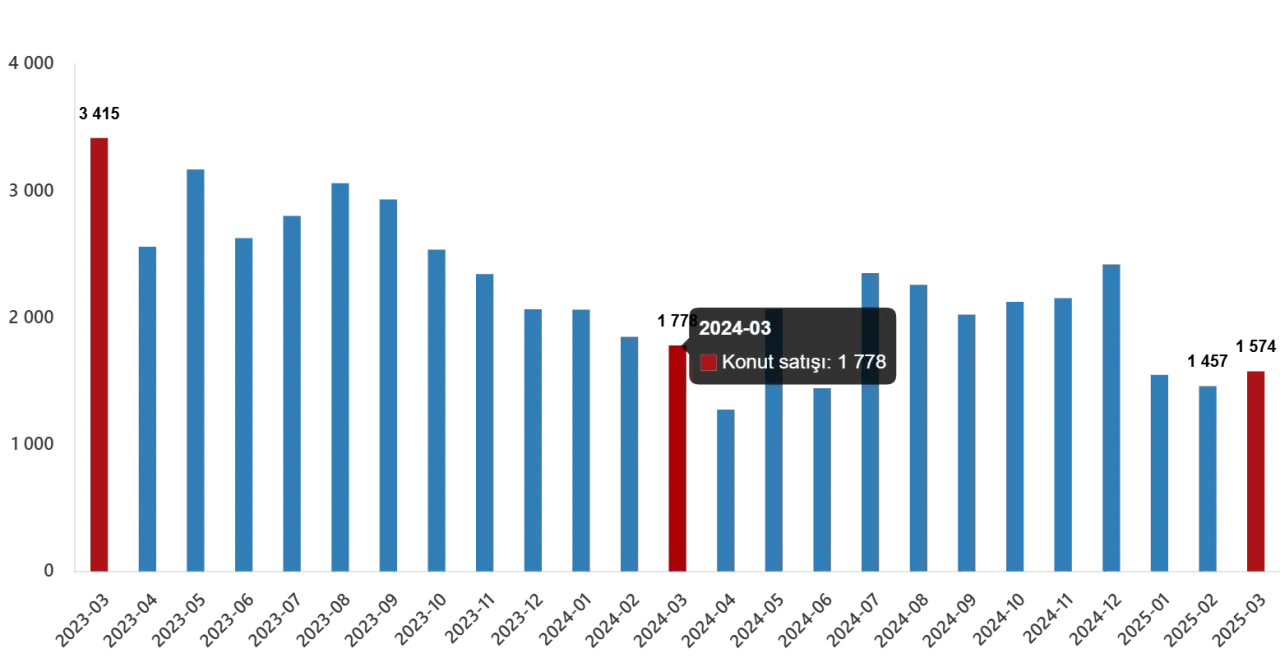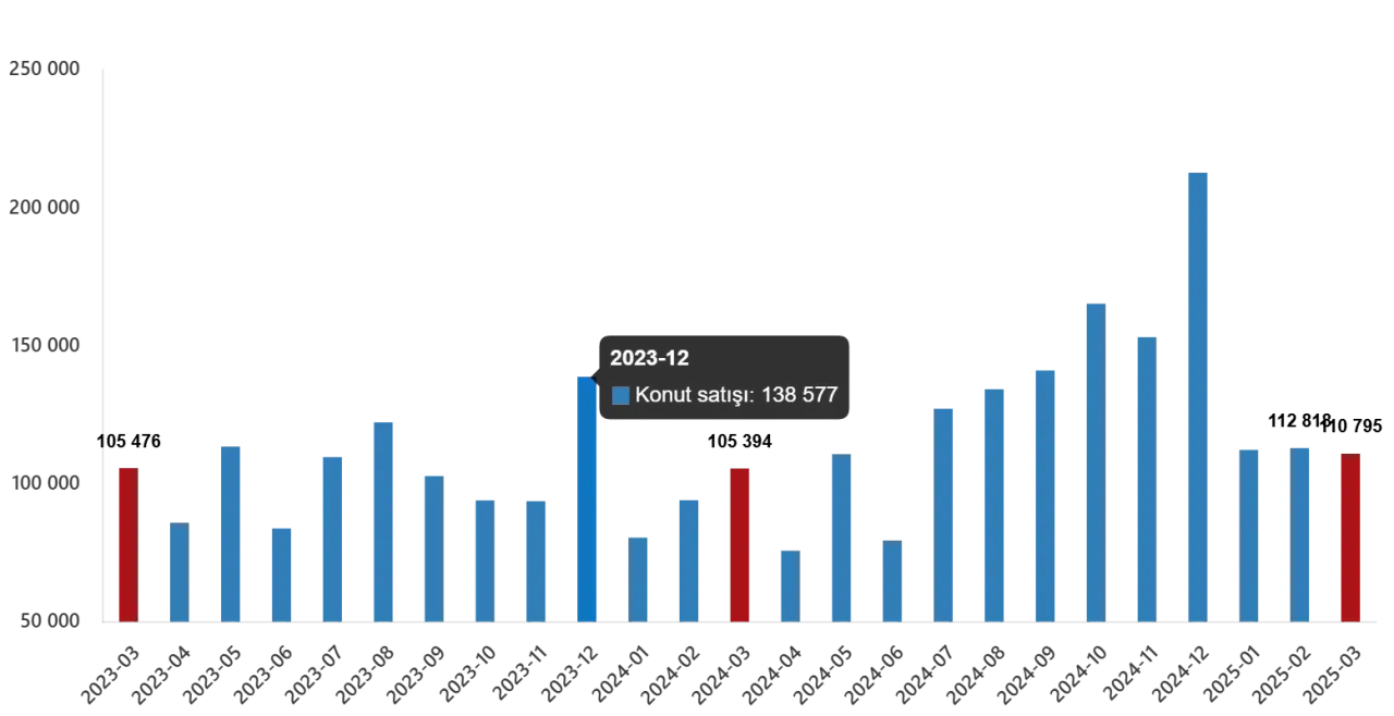 TÜİK (Türkiye İstatistik Kurumu) Mart 2025 Konut Satış İstatistiklerini açıkladı. Rapora göre, Türkiye genelinde konut satışları mart ayında bir önceki yılın aynı ayına göre yüzde 5,1 oranında artarak 110 bin 795 oldu. Konut satış sayısının en fazla olduğu iller sırasıyla 19 bin 820 ile İstanbul, 10 bin 203 ile Ankara ve 7 bin 513 ile İzmir olurken, en az olduğu iller sırasıyla 28 ile Ardahan, 33 ile Bayburt ve 63 ile Tunceli olarak gerçekleşti.