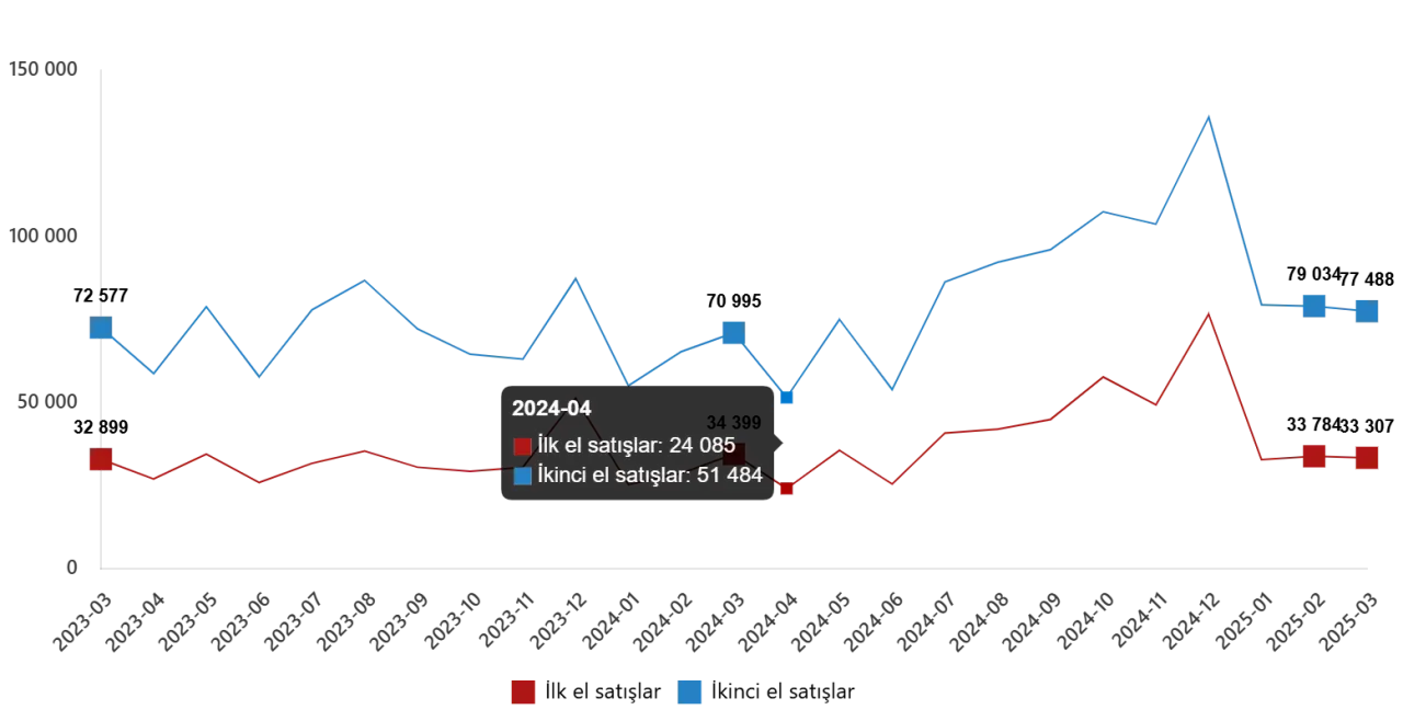 Türkiye genelinde ikinci el konut satış sayısı mart ayında bir önceki yılın aynı ayına göre yüzde 9,1 oranında artarak 77 bin 488 oldu. Toplam konut satışları içinde ikinci el konut satışının payı yüzde 69,9 oldu. İkinci el konut satışları Ocak-Mart döneminde ise bir önceki yılın aynı dönemine göre yüzde 23,3 oranında artarak 235 bin 910 olarak gerçekleşti.