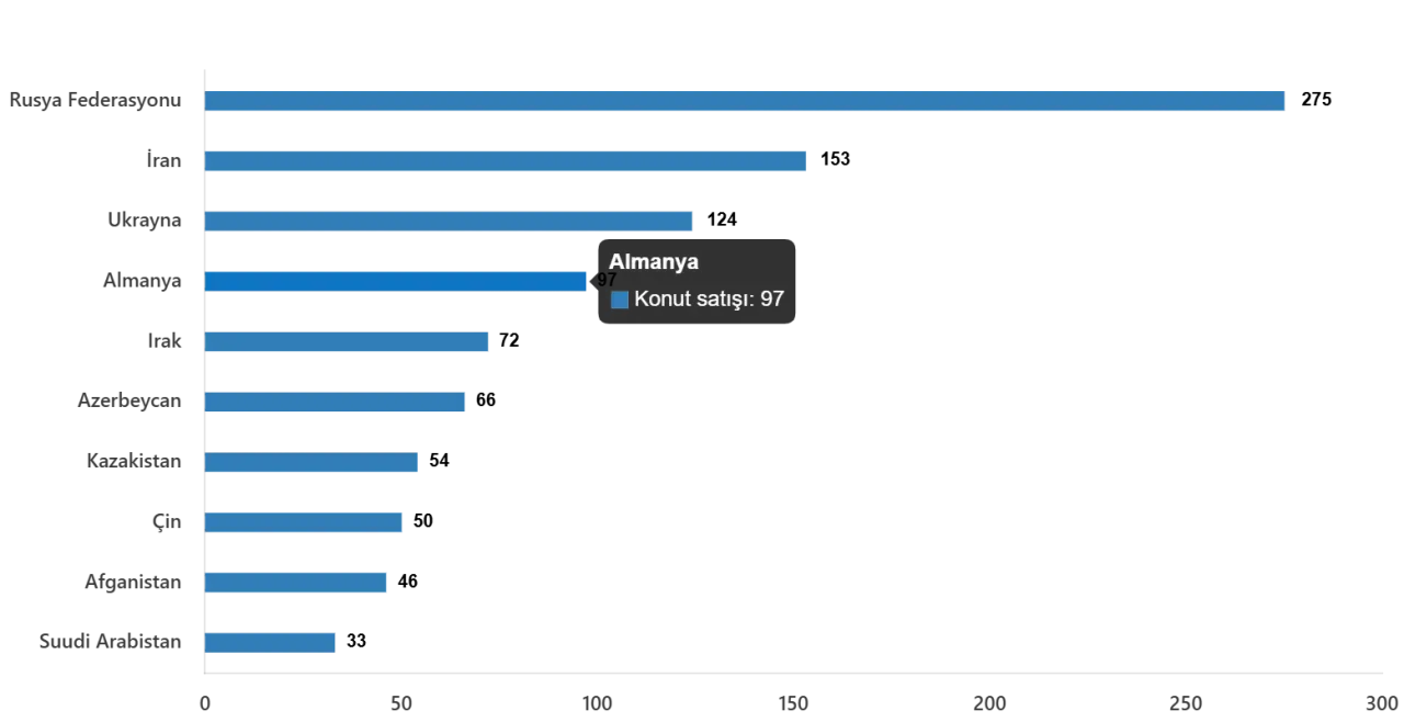 Yabancılara yapılan konut satışları Ocak-Mart döneminde bir önceki yılın aynı dönemine göre yüzde 19,5 oranında azalarak 4 bin 578 oldu. Mart ayında ülke uyruklarına göre en fazla konut satışı sırasıyla 275 ile Rusya Federasyonu, 153 ile İran ve 124 ile Ukrayna vatandaşlarına yapıldı.