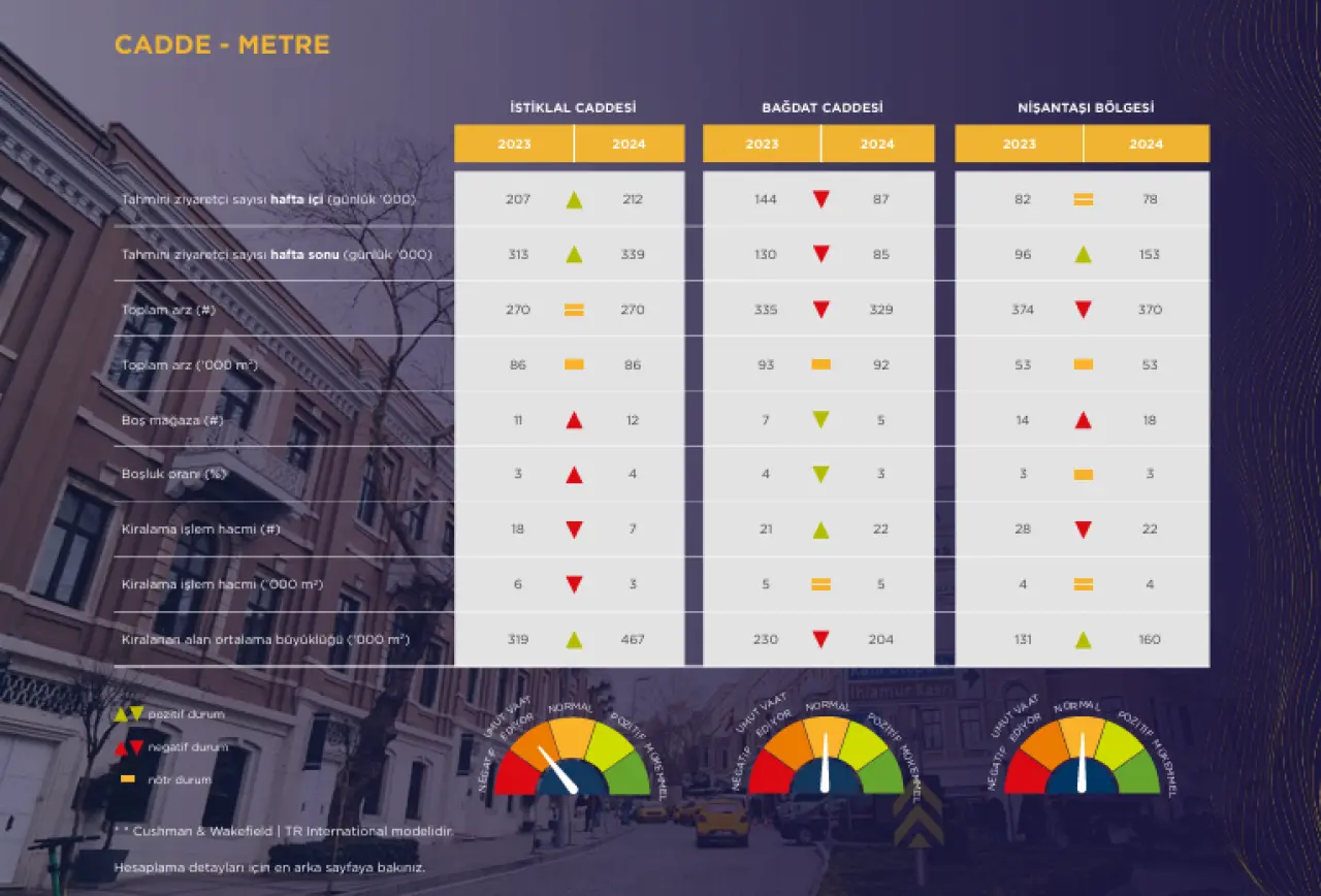 2024 yılında İstiklal Caddesi, Bağdat Caddesi ve Nişantaşı bölgesinde yüksek talep, sınırlı arz ve yüksek kira seviyeleri nedeniyle uygun yer bulmanın zorlaştığı belirtilen raporda, kentsel dönüşüm projelerinin tamamlanmasıyla yeni arzın caddelere katılması bekleniyor.