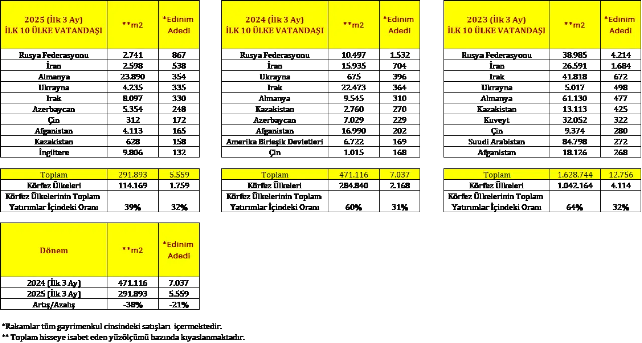 2025 yılı ilk üç ay itibarıyla Türkiye genelinde yabancılara yapılan toplam gayrimenkul satış adetinde ise geçtiğimiz sene de ilk sırada yer alan Rusya Federasyonu ilk sırayı aldı. Rusya Federasyonu’nu İran, Almanya, Ukrayna, Irak, Azerbaycan, Çin, Afganistan, Kazakistan ve İngiltere takip etti.