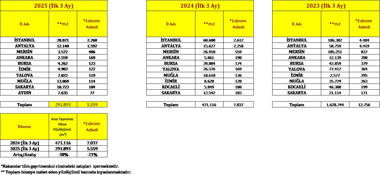 Yabancı yatırımcıların 2025 ve 2024 ilk üç ay itibarıyla Türkiye’de gerçekleştirdikleri tüm gayrimenkul cinsinden alımları mercek altına alan EVA Gayrimenkul Değerleme, alan bazında 2025 yılının ilk 3 ayı itibarıyla 2024 yılının aynı dönemine kıyasla metrekare bazında yüzde 38, işlem sayısında ise yüzde 21 düşüş olduğunu belirledi.